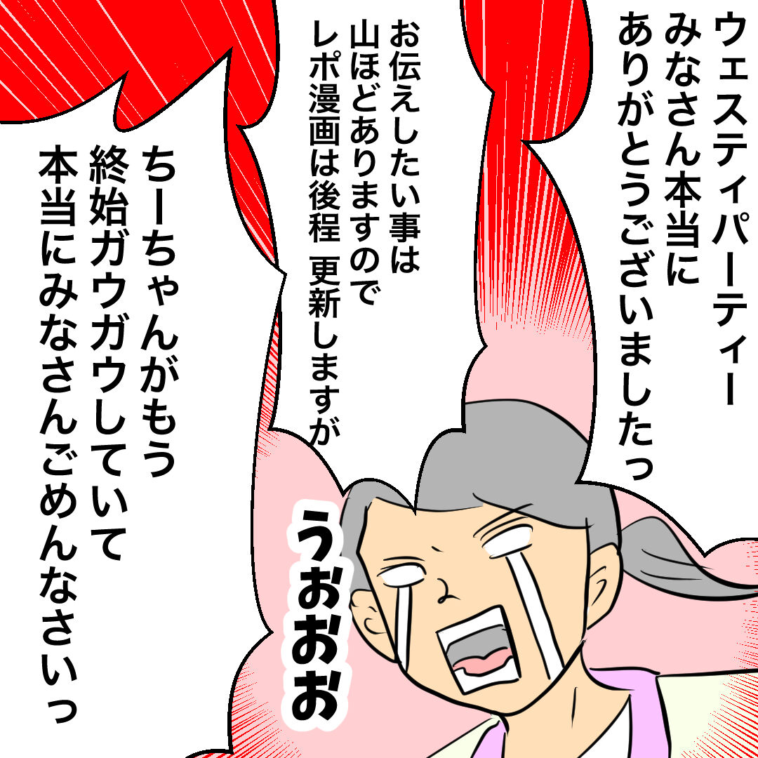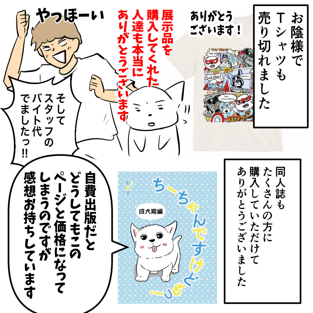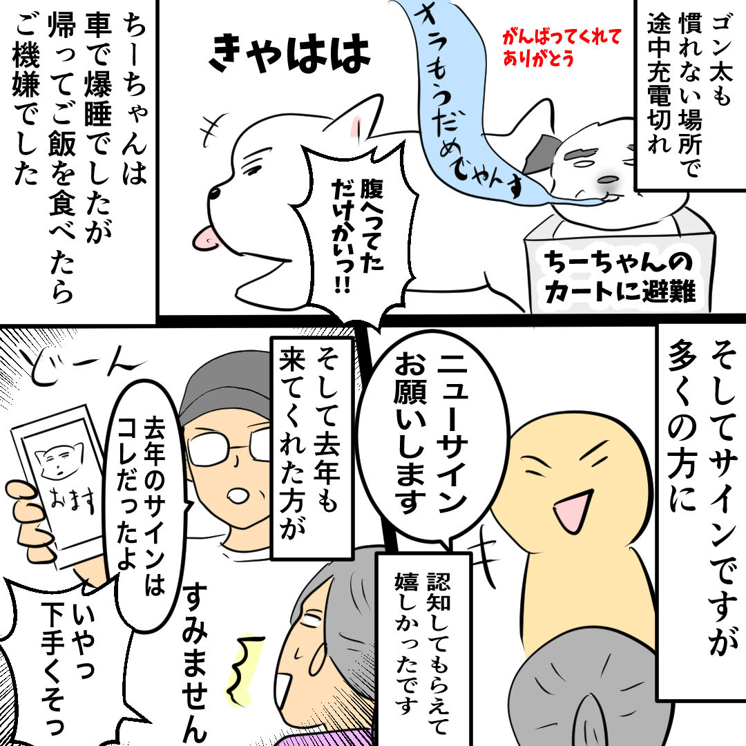 🐶ウエスティパーティーありがとうございますですけどもっ🐾 2024年10月30日 21:57 🐶『わんちゃんホンポ』にて〝ちーちゃんですけどもっ〟の最新話が更新されました❣️こちらもよろしくお願いします🐶🙇♀️🐶あらためてウェスティパーティーありがとうございました😊レポ漫画は後日きちんとまた描きます。🐶グッズについて多くのお問い合わせをいただきました❗️11月から更新ショップにて販売いたします🙇♀️オンライン決済が難しい場合にはDMかcheezu.oms@gmail.comにご連絡下さいませ。作者から直接お送りいたします。 🐶あらためて、来ていただいた皆様!本当にありがとうございました!そして運営の皆様に感謝致します。最後に、一緒に頑張ってくれたスタッフやゴン太、ちーちゃんありがとう😊 「ウエスティーパーティー」カテゴリの最新記事 タグ :#ウェスティ#パーティー#グッズ#漫画#ブログ#シニア犬 < 前の記事次の記事 > コメント コメント一覧 (2) 1. もも 2024年10月31日 10:55 うちのシニア犬もその日の体調やお天気や周りの環境等によって普段仲の良いワンちゃんや飼い主さんにさえガウガウしてしまうことあります。逆にされちゃうことも。でもねそれが普通なんじゃないかなぁ😊盲導犬等ならいざ知らず。ちーちゃんが悪いのでも作者さんが悪いのでもないように思います。動物好きの人なら皆きっとそう思ってるはずです。そしてちーちゃんはそこに居てくれるだけで元気な姿を見れるだけでもいいように私は思います。それで十分嬉しいです🥰🎶 0 おます がしました 2. イヌドッグ 2024年10月31日 16:23 ちーちゃんに会いに来る人の気持ちわかります。 北海道だと遠すぎて中々難しいですが、ちーちゃんグッズを飼って応援させていただきますね! ちーちゃんのアメコミTシャツは売り切れるでしょうね(笑) すごい好きなデザインです。 吠えて疲れたかもしれないけど、 ちーちゃん来てくれてみんなうれしいだろうな。 お疲れさまでした。 バイトさんもご苦労様です! 0 おます がしました コメントフォーム 名前 コメント 記事の評価 リセット リセット 顔 星 情報を記憶 コメントを投稿する