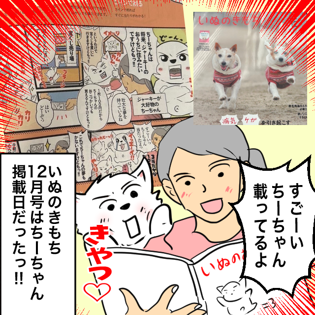 わんこを飼っていたら、一度は聞いた事がある雑誌ですので、まさか15年後の今に自分の漫画が掲載できるとは思いませんでした。また、ちーちゃんが15歳になってまだ元気でいてくれる事が何よりも感謝です。こんなにも多くの方々に応援してもらえて、月並みの言葉ですが、わたしには感謝しかありません。これからも、ちーちゃんの体を第一に考えながら、マイペースに更新していきます。本当にありがとうございます😊