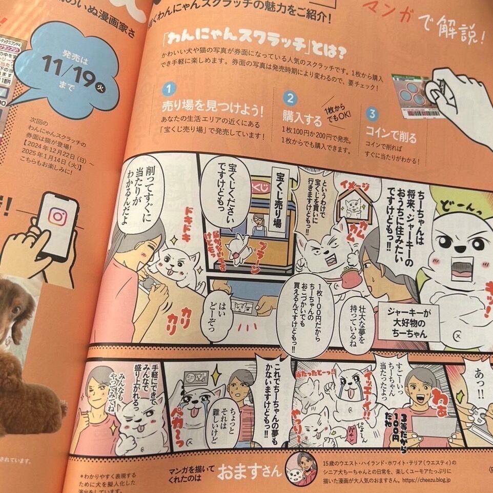 以前から宣伝させていただきました、〝いぬのきもち12月号〟(11月発売)に、〝わんにゃんスクラッチ〟というクジの宣伝漫画を描かせていただきました。今回はちーちゃんを載せてもOKという事で大変ありがたく楽しく描かせてもらえました!